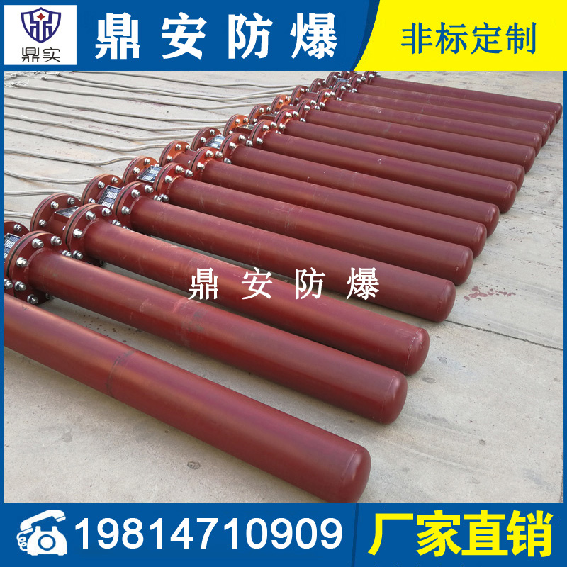 防爆法蘭加熱管是由多支加熱管焊接在法蘭上集中加熱。主要用于敞開式、封閉式的溶液箱和循環(huán)系統(tǒng)中加熱用。優(yōu)點: 表面功率大,使一般電加熱表面負荷的2~4倍,高度密集式、結(jié)構(gòu)緊湊。由于整體短而密集,故穩(wěn)定性好,安裝無需支架。組合式法蘭加熱管大多采用氬弧焊接方式使電熱管于法蘭連接,也可利用緊固裝置的形式,即每支電熱管上焊由緊固件。然后與法蘭蓋采用螺母鎖緊。管子于緊固件采用氬弧焊接。緊固件密封處采用科學的工藝。單支更換方便,大大節(jié)約以后的維修成本選擇進口及國內(nèi)優(yōu)質(zhì)材料??茖W的生產(chǎn)工藝,嚴格的質(zhì)量管理,保證電熱管優(yōu)越的電氣性能。