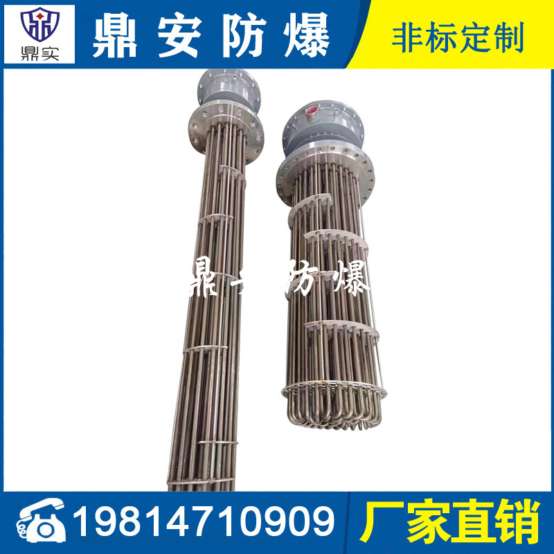 防爆法蘭電加熱管(也稱插入式電加熱器):是采用U型管狀電熱元件,依據(jù)加熱不同介質(zhì)設(shè)計規(guī)范,按照功率配置要求裝配在法蘭蓋上,插入需加熱物料中,發(fā)熱元件工作時所發(fā)出的大量熱量傳導給被加熱介質(zhì)使介質(zhì)溫度升高,達到所需的工藝要求。當介質(zhì)溫度達到工藝要求的設(shè)定值時,控制系統(tǒng)根據(jù)溫度傳感器信號,經(jīng)PID 運算后調(diào)節(jié)電加熱器輸出功率,對發(fā)熱元件的電阻性負載實現(xiàn)溫度控制。使介質(zhì)溫度均勻,達到所需要求;當發(fā)熱元件超溫或低液位時,發(fā)熱元件的聯(lián)鎖保護裝置立即切斷加熱電源避免發(fā)熱元件燒壞,延長使用壽命。