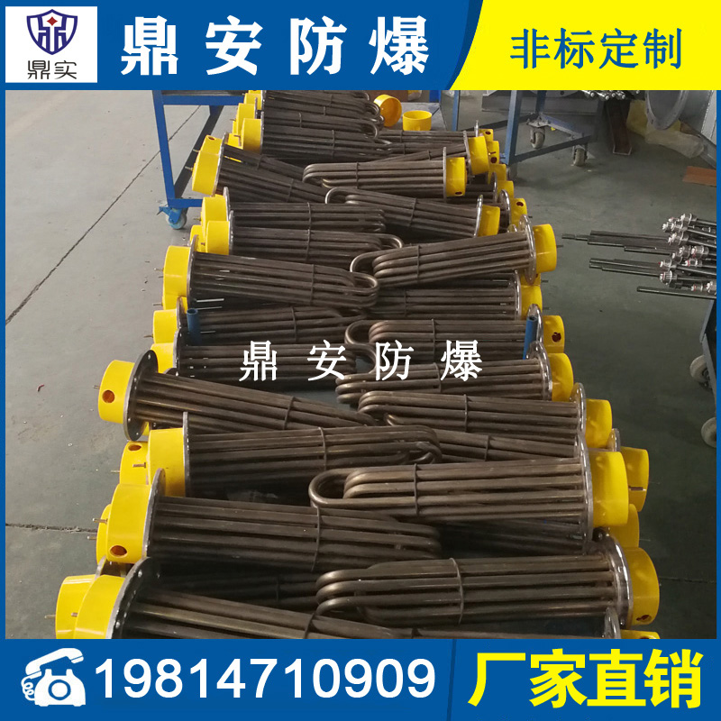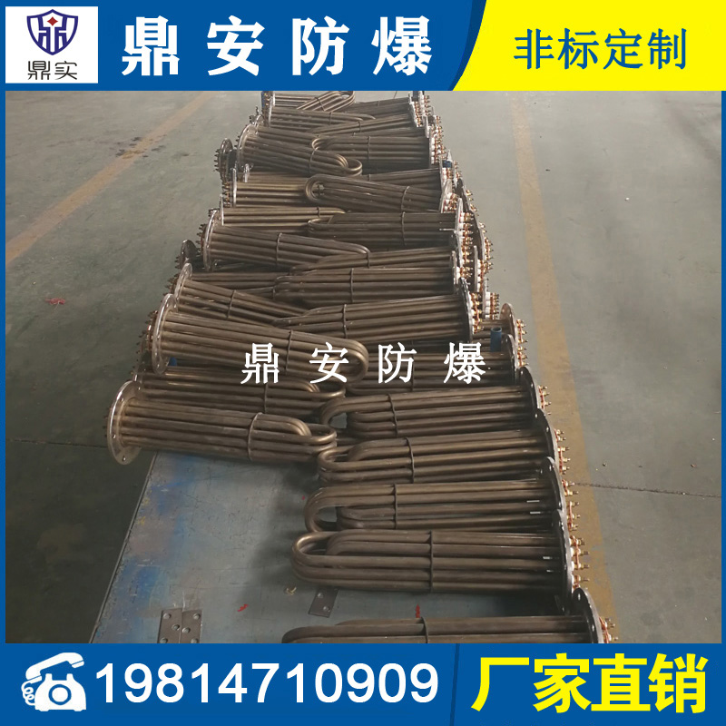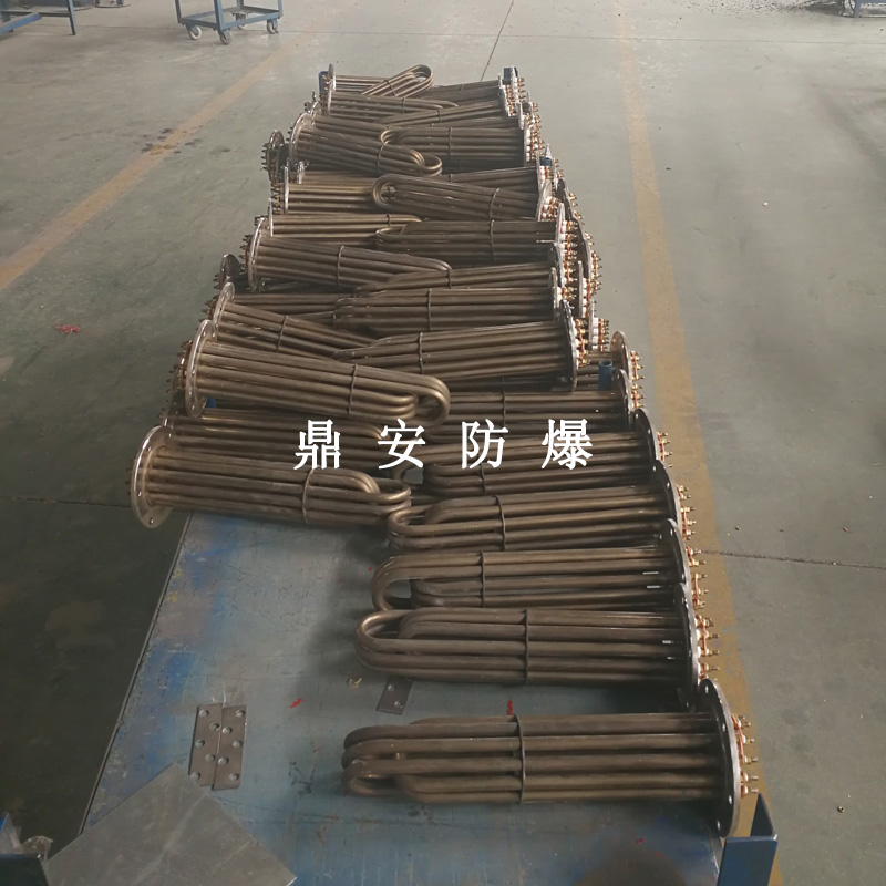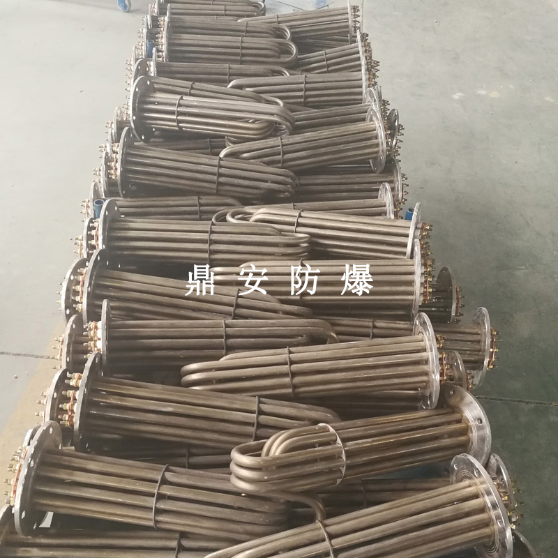 法蘭電熱管(也稱插入式電加熱器):是采用U型管狀電熱元件,多支U型電熱管焊接在法蘭上集中加熱,依據(jù)加熱不同介質(zhì)設(shè)計規(guī)范,按照功率配置要求裝配在法蘭蓋上,插入需加熱物料中,發(fā)熱元件工作時所發(fā)出的大量熱量傳導給被加熱介質(zhì)使介質(zhì)溫度升高,達到所需的工藝要求,主要用于敞開式、封閉式的溶液箱和循環(huán)系統(tǒng)中加熱用。