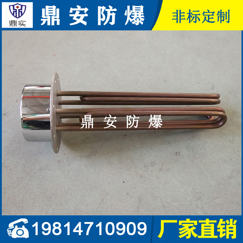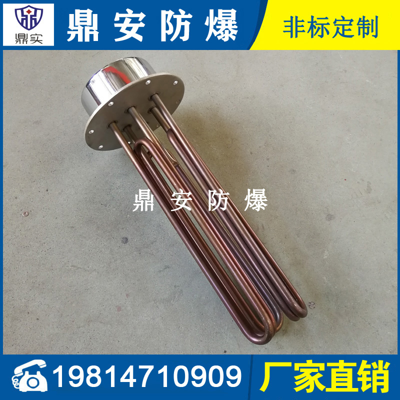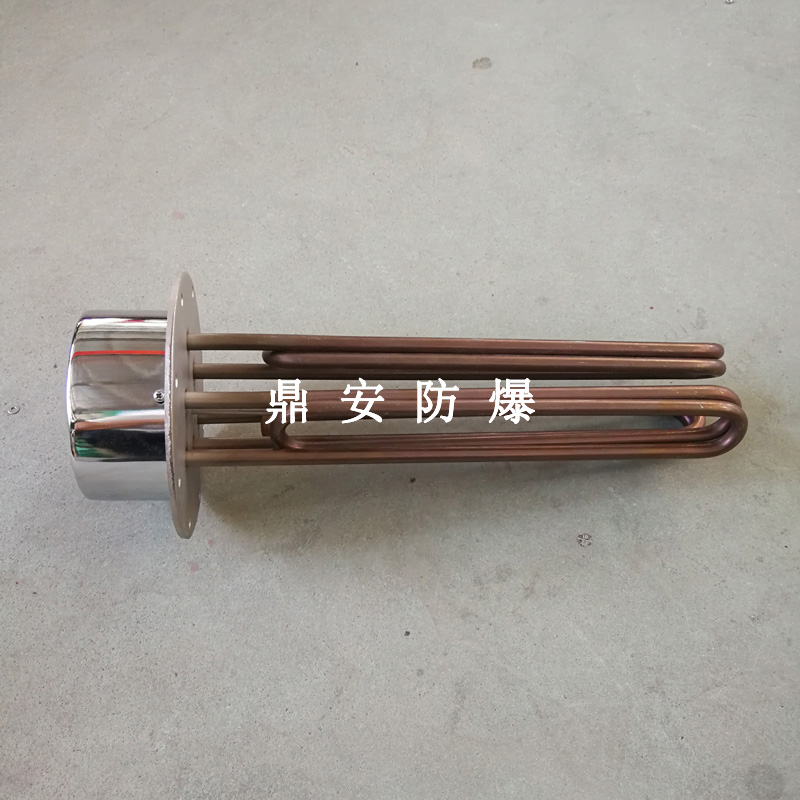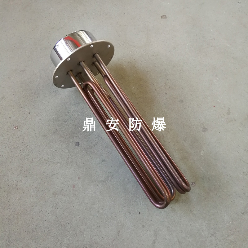 法蘭電熱管(也稱插入式電加熱器):是采用U型管狀電熱元件,多支U型電熱管焊接在法蘭上集中加熱,依據(jù)加熱不同介質(zhì)設(shè)計規(guī)范,按照功率配置要求裝配在法蘭蓋上,插入需加熱物料中,發(fā)熱元件工作時所發(fā)出的大量熱量傳導(dǎo)給被加熱介質(zhì)使介質(zhì)溫度升高,達到所需的工藝要求,主要用于敞開式、封閉式的溶液箱和循環(huán)系統(tǒng)中加熱用。