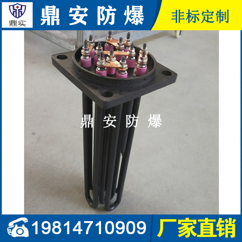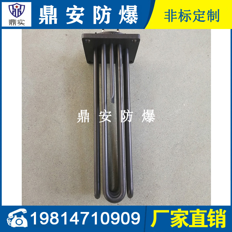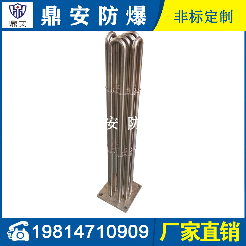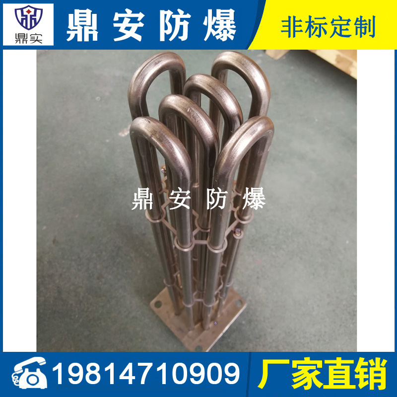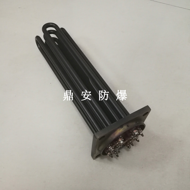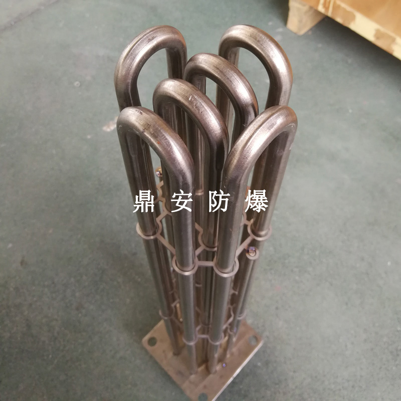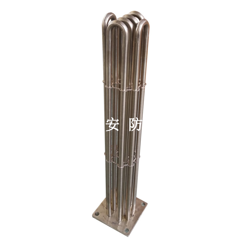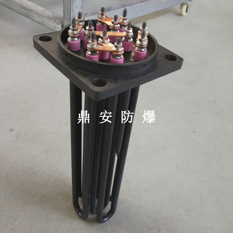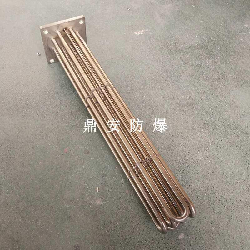 法蘭電熱管(也稱插入式電加熱器):是采用U型管狀電熱元件,多支U型電熱管焊接在法蘭上集中加熱,依據(jù)加熱不同介質(zhì)設(shè)計(jì)規(guī)范,按照功率配置要求裝配在法蘭蓋上,插入需加熱物料中,發(fā)熱元件工作時(shí)所發(fā)出的大量熱量傳導(dǎo)給被加熱介質(zhì)使介質(zhì)溫度升高,達(dá)到所需的工藝要求,主要用于敞開(kāi)式、封閉式的溶液箱和循環(huán)系統(tǒng)中加熱用。