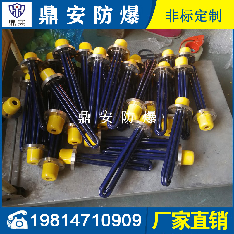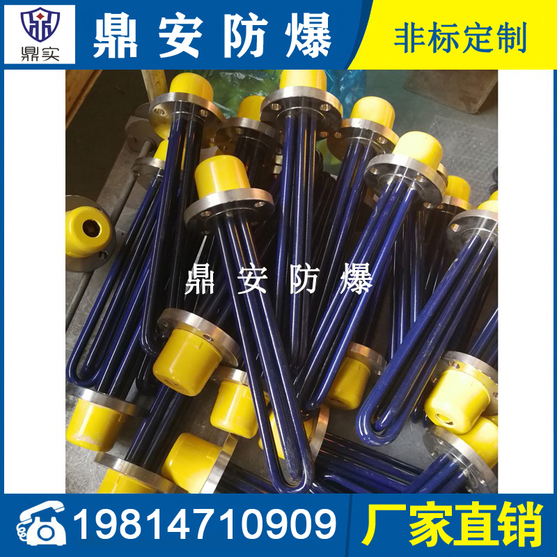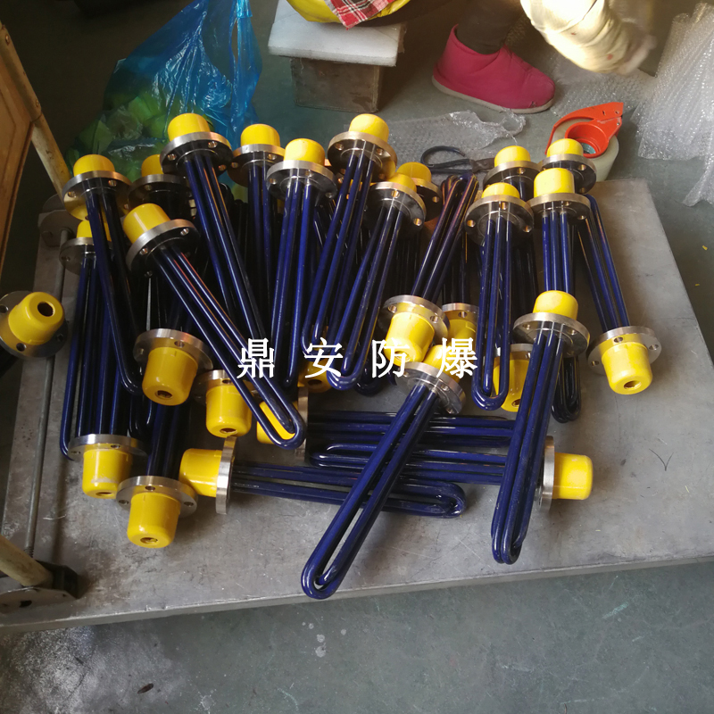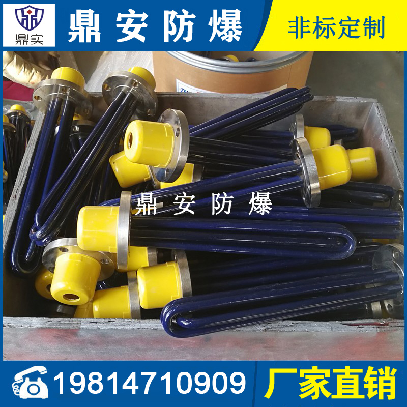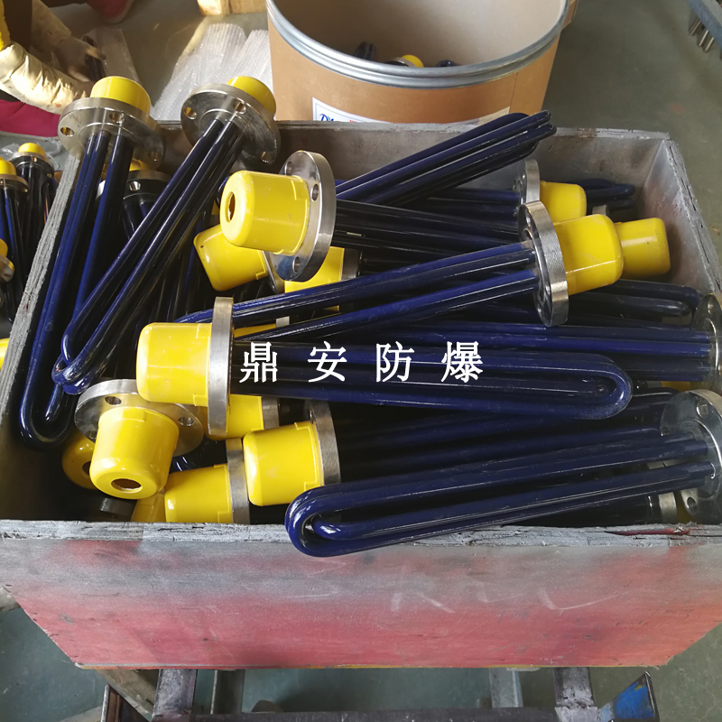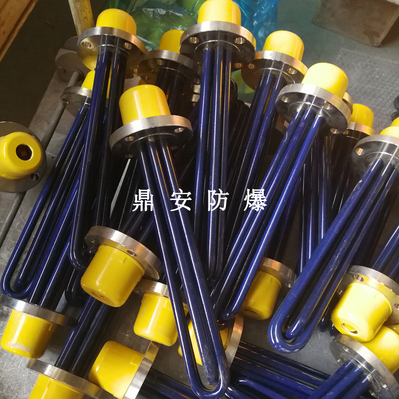 法蘭電熱管(也稱插入式電加熱器):是采用U型管狀電熱元件,多支U型電熱管焊接在法蘭上集中加熱,依據(jù)加熱不同介質(zhì)設(shè)計規(guī)范,按照功率配置要求裝配在法蘭蓋上,插入需加熱物料中,發(fā)熱元件工作時所發(fā)出的大量熱量傳導(dǎo)給被加熱介質(zhì)使介質(zhì)溫度升高,達到所需的工藝要求,主要用于敞開式、封閉式的溶液箱和循環(huán)系統(tǒng)中加熱用。