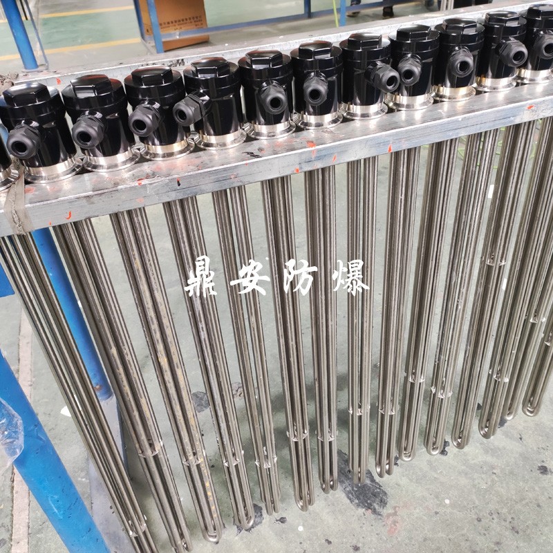 法蘭電熱管(也稱插入式電加熱器):是采用U型管狀電熱元件,多支U型電熱管焊接在法蘭上集中加熱,依據(jù)加熱不同介質設計規(guī)范,按照功率配置要求裝配在法蘭蓋上,插入需加熱物料中,發(fā)熱元件工作時所發(fā)出的大量熱量傳導給被加熱介質使介質溫度升高,達到所需的工藝要求,主要用于敞開式、封閉式的溶液箱和循環(huán)系統(tǒng)中加熱用。