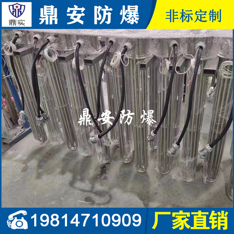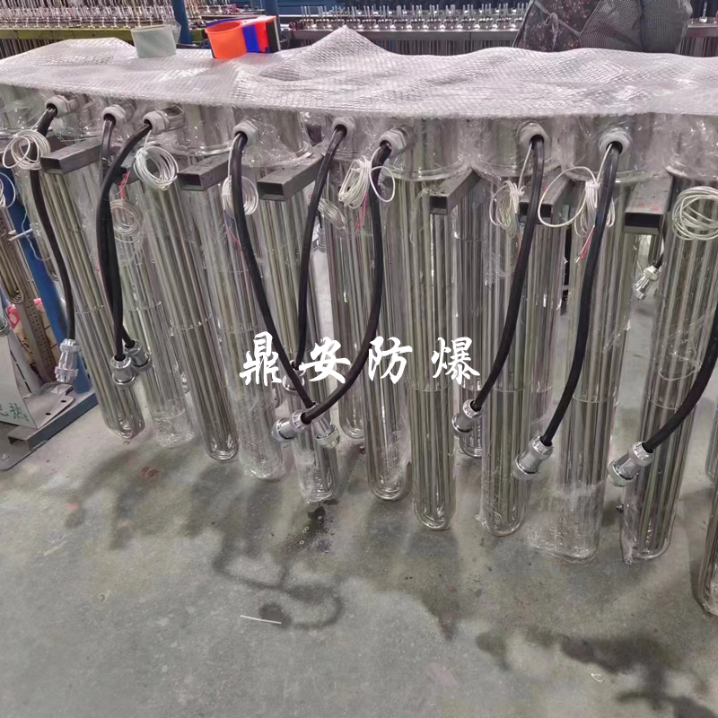 法蘭電熱管(也稱插入式電加熱器):是采用U型管狀電熱元件,多支U型電熱管焊接在法蘭上集中加熱,依據(jù)加熱不同介質(zhì)設(shè)計規(guī)范,按照功率配置要求裝配在法蘭蓋上,插入需加熱物料中,發(fā)熱元件工作時所發(fā)出的大量熱量傳導給被加熱介質(zhì)使介質(zhì)溫度升高,達到所需的工藝要求,主要用于敞開式、封閉式的溶液箱和循環(huán)系統(tǒng)中加熱用。